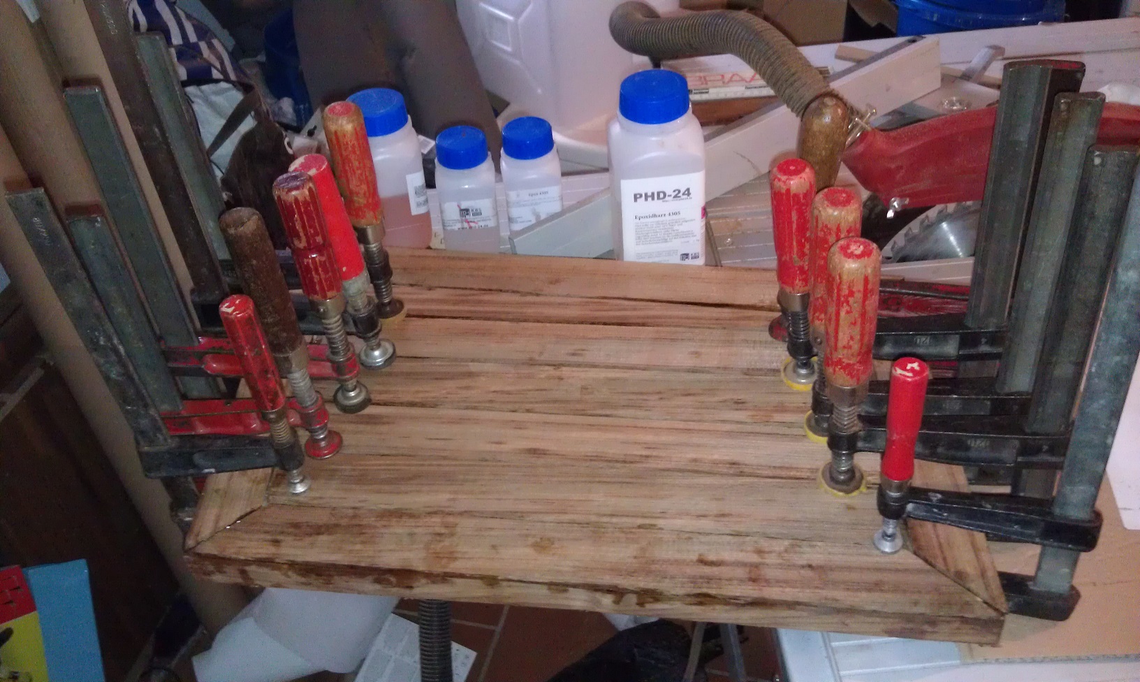 Hier noch einmal der Dank an meinen Nachbarn für die wirklcih guten Schraubzwingen und die stabilen Hölzer zum Verteilen der Drucklast.