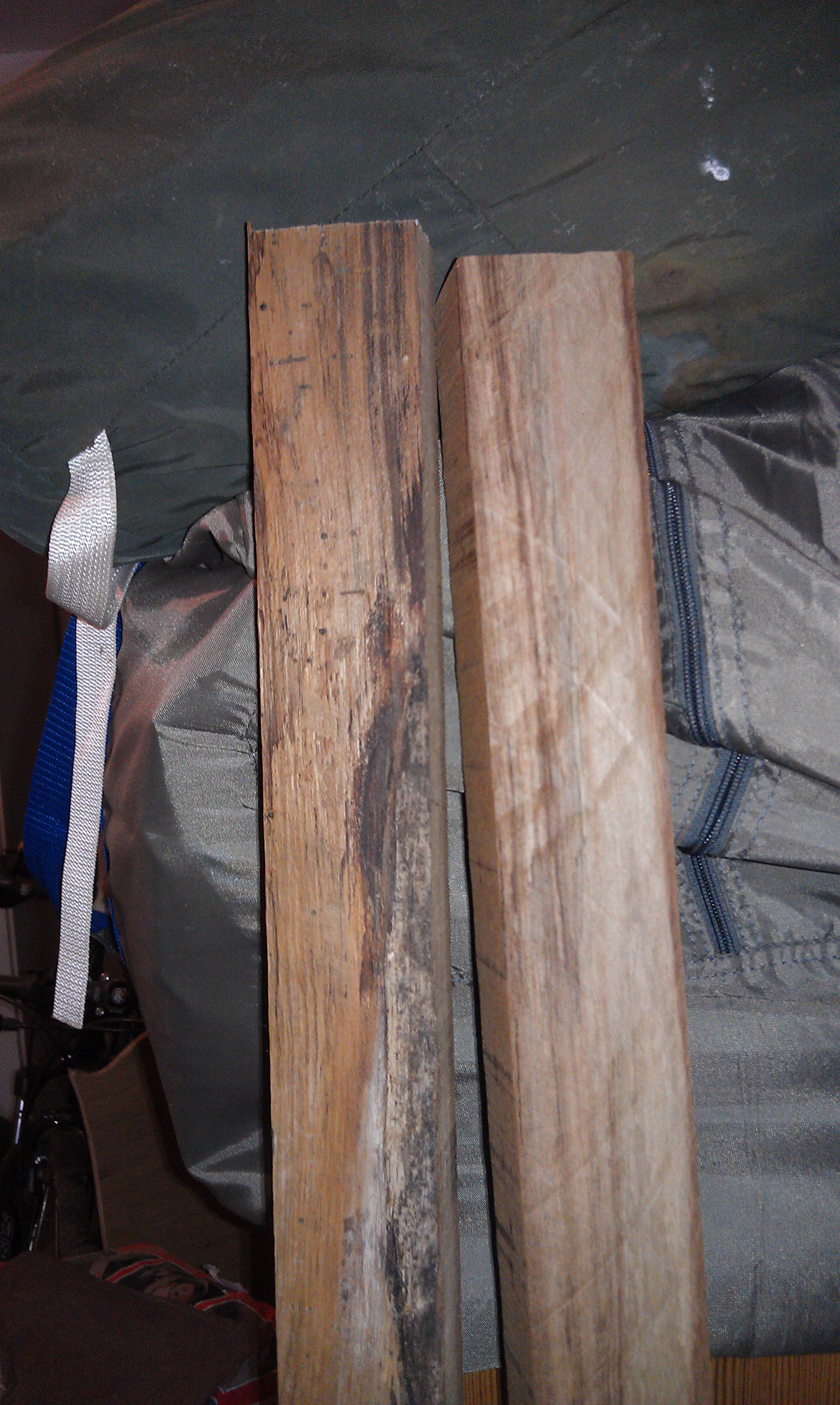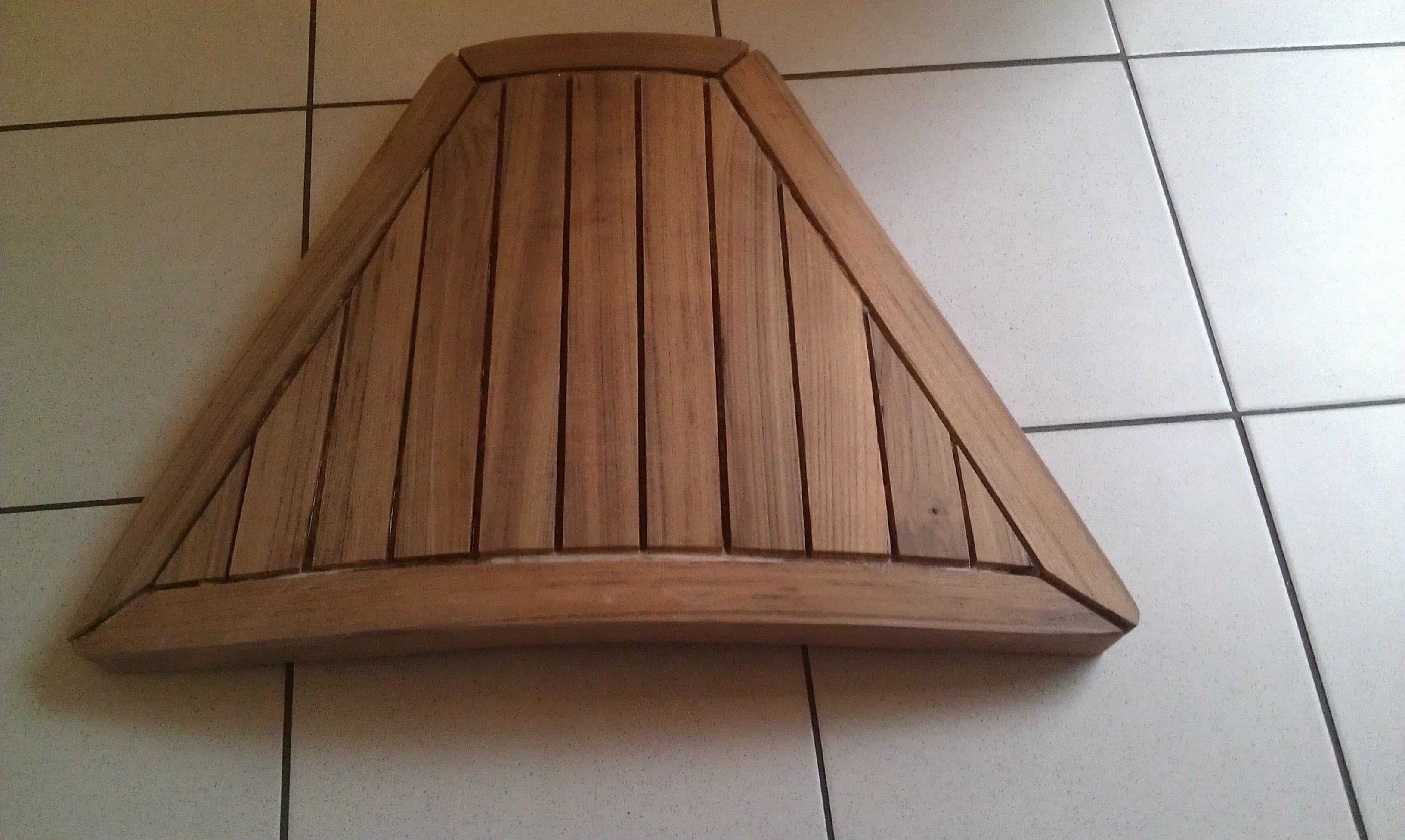 Die vorhandenen Backskistendeckel aus Laminatplatten sind extrem haltbar und wurden weiterverwendet. Die Kanten wurden um jeweils 1 cm gekürzt und Teakholzleisten mit Epoxydharz (angedickt mit Baumwollflocken, diese sollen eine höhere Festigkeit bieten als Micro-Balloons) beklebt.