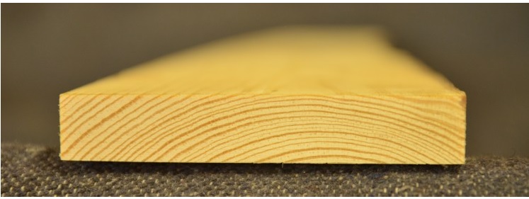 Ein Beispiel für liegende und halbstehende Jahresringe. Dieses Brett würde sich beim Biegen spalten.