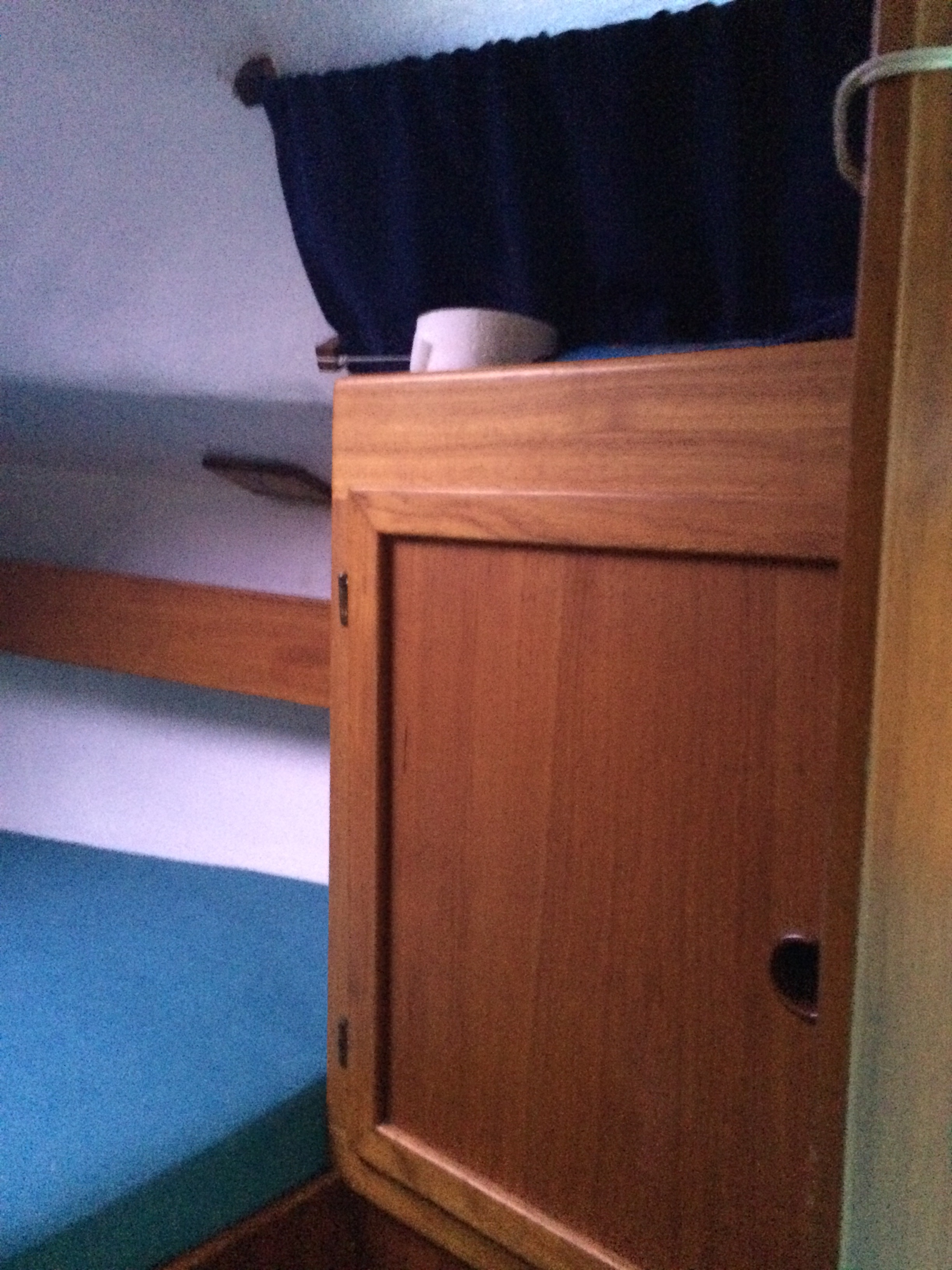 Der Schrank unter dem Niedergang kann als Stufe genutzt werden, ein kleines Waschbecken mit Wasserhahn befindet sich darunter. Der Wasserhahn wird elektrisch über eine Tauchpumpe aus einem Wasserkanister in der Backskiste gespeist.