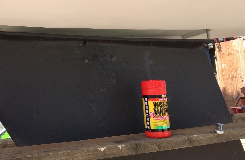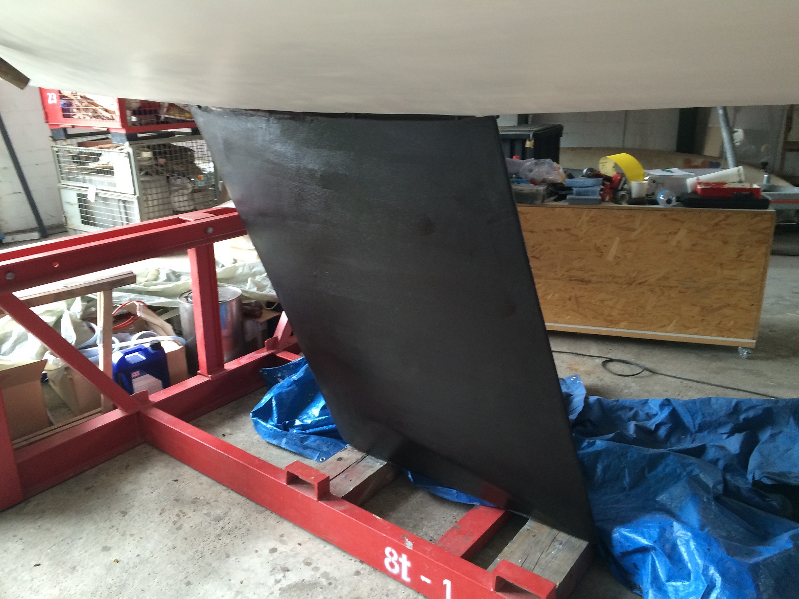 Die Unebenheiten nach dem Sandstrahlen und der Beschichtung wurden mit Light Filler gespachtelt und der Kiel dann noch einmal noch einmal mit zwei Schichten Teerepoxyd versiegelt und zuletzt mit Antiifouling beschichtet.