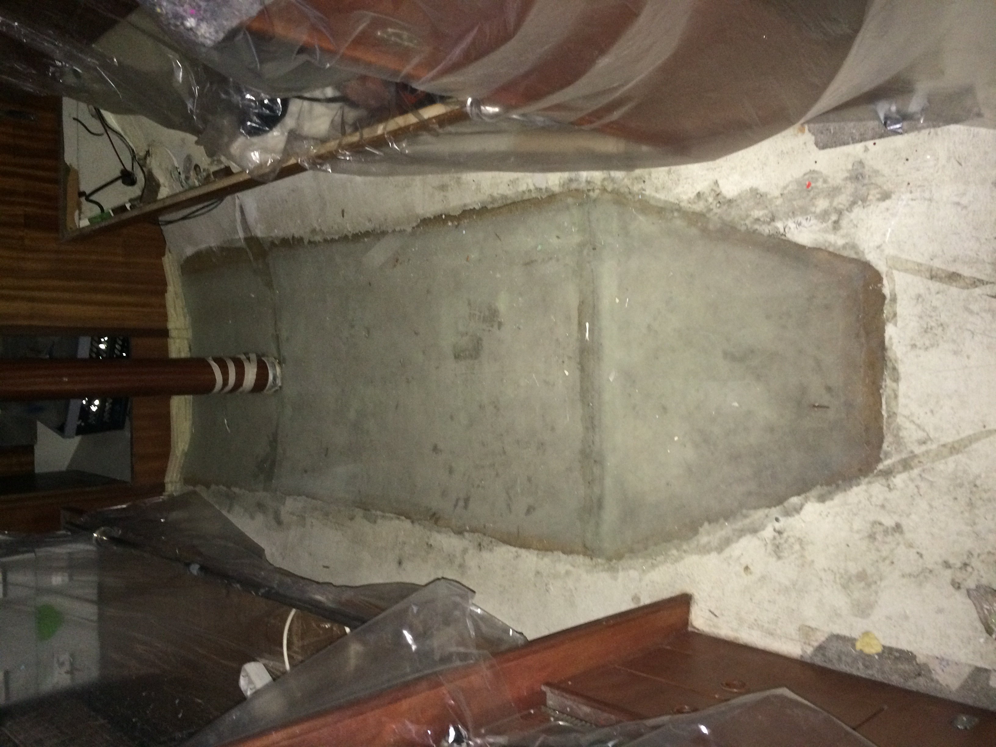 Um die Kielbolzen herum war an einigen Stellen der Spachtel gerissen. Ich habe diesen auch gleich mit geöffnet und mir den Bereich um die Kielbolzen näher angesehen. Der Kielbereich besteht aus ca. 1 cm GFK unten, einer Holzplatte, 1 cm GFK oben. Um die Kilebolzen ist der Bereich an Stelle der Holzplatte mit GFK abgedichtet und unter dem finalen Spachtel mit einer V4A Platte abgedeckt.